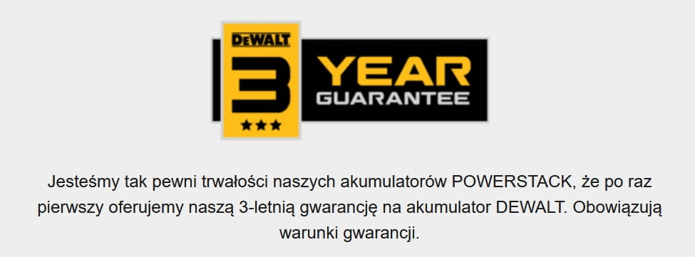 - Jesteśmy tak pewni trwałości naszych akumulatorów POWERSTACK, że po raz pierwszy oferujemy naszą 3-letnią gwarancję na akumulator DEWALT. Obowiązują warunki gwarancji.