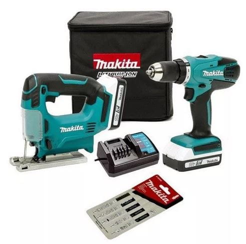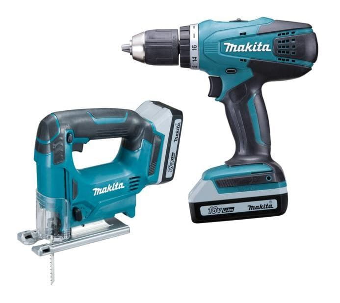 Zestaw narzędzi firmy Makita składający się z wkrętarki DF457D i wyrzynarki JV183D.