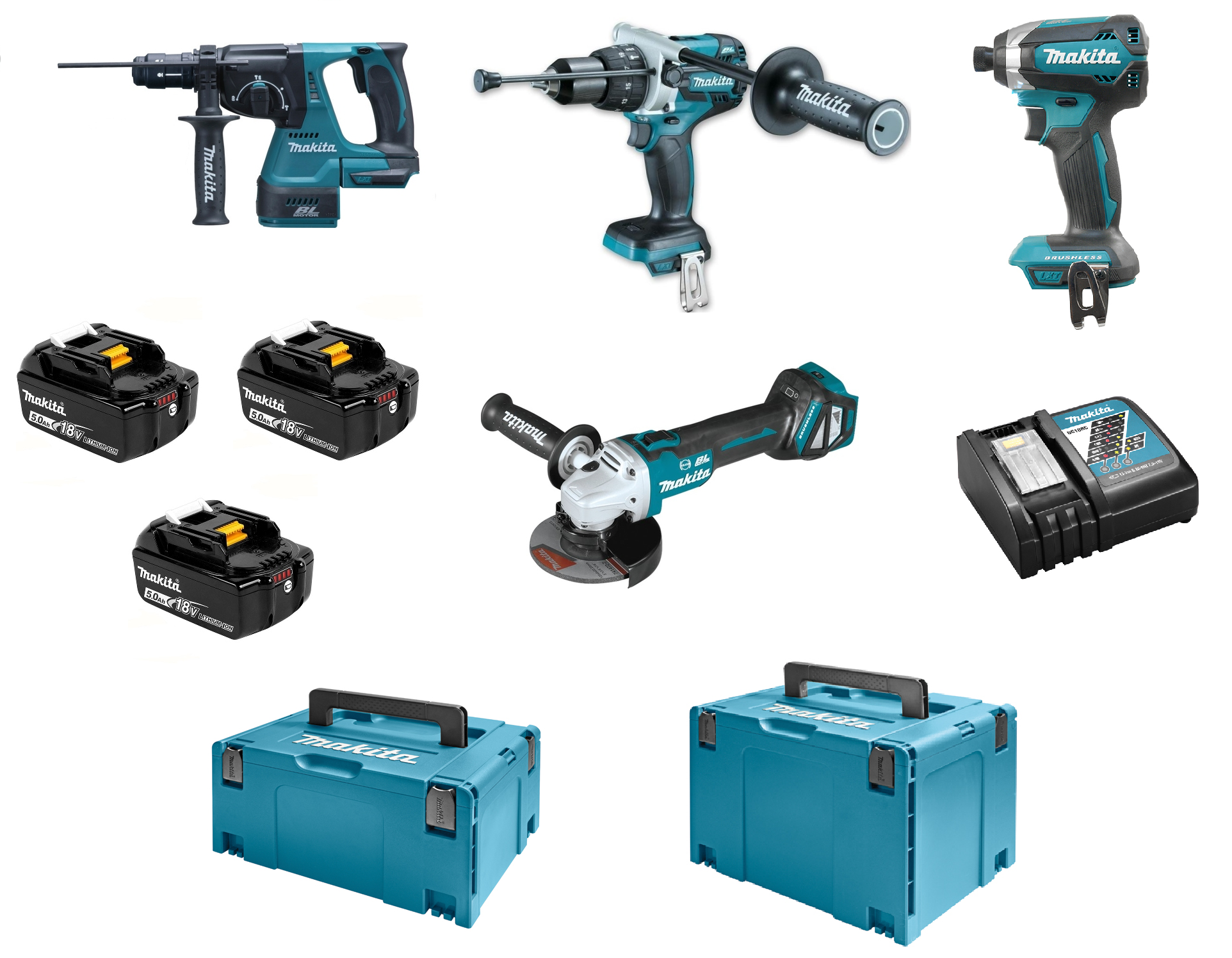 Wszystekie urządzenia są kompatybilne z akumulatorami Makita serii LXT 18V np. BL1815N, BL1820, BL1820B, BL1830, BL1830B, BL1840, BL1840B, BL1850, BL1850B, BL1860B.