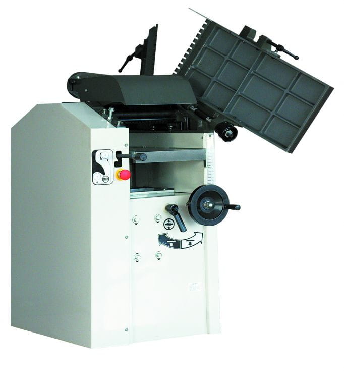 - stół „grubościówki” z posuwem o szerokości 310 mm, sterowany gałką obsługiwaną ręcznie, na grubość obrabianego materiału w zakresie 0-180